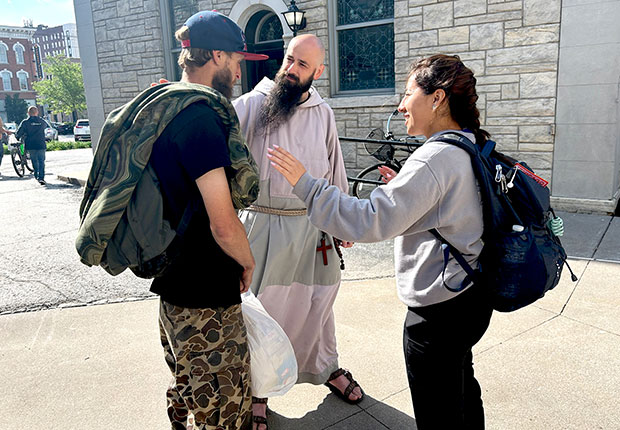 In the courtyard outside the area where people pick up a free meal at McAnthony Window in Davenport, Brother Jan Cyril Vanek, CFR, and perpetual pilgrim Leslie prayed for a lean man wearing army fatigues and a baseball cap. It was May 23, the National Eucharistic Pilgrimage’s final stop in the Davenport Diocese. They had spent the morning in prayer and ministering to people in need at the window, a ministry of St. Anthony Parish. A service project debriefing, Mass and lunch rounded out the first half of their day before heading to the Archdiocese of Dubuque.