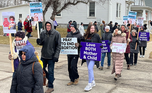 Pro-life advocates hold signs during the 2022 March for Life in Iowa City.