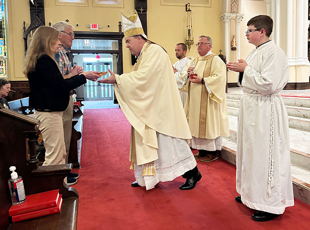 Bishop Dennis Walsh receives the gifts from Jim Tiedje and Lisa Tibbetts during the Liturgy of the Eucharist at the Mass for Pope Leo XIV May 27 in Sacred Heart Cathedral-Davenport.