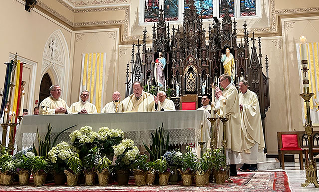 Bishop Dennis Walsh presided at Mass, with five priests concelebrating, two deacons assisting and Deacon Frank Agnoli serving as master of ceremonies. The worship aid provided the Scripture readings, responsorial psalm and other parts of the Mass in each of the three languages, along with an explanation of Pope Leo’s coat of arms.  His coat of arms is a “clear reflection of his Augustinian roots and the values he seeks to promote during his pontificate, particularly unity and communion with the Church.”