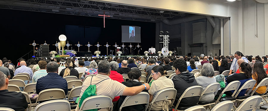 OTTUMWA — Más de 1,000 católicos hispanos se reunieron en el Bridge View Center el sábado 12 de julio para celebrar la fuente y cumbre de la vida cristiana: la Eucaristía. La V Conferencia Católica Hispana, organizada por la Oficina del Ministerio Multicultural de la Diócesis de Davenport, se inspiró en el Avivamiento Eucarístico Nacional y el Año Jubilar de la Esperanza.