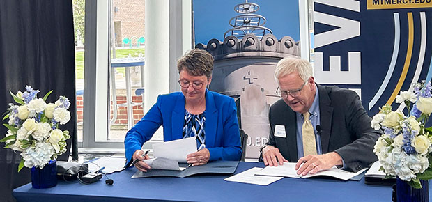 St. Ambrose University-Davenport President Amy Novak and Mount Mercy University-Cedar Rapids, Iowa President Todd Olson sign documents related to completion of the first step of their universities’ strategic combination on June 27 at Mount Mercy.