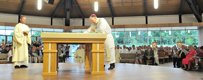 Bishop Dennis Walsh anoints the altar with chrism oil during the Rite of Dedication at St. Thomas More Catholic Church in Coralville on Aug. 24 as Deacon Jim Vonderhaar looks on.
