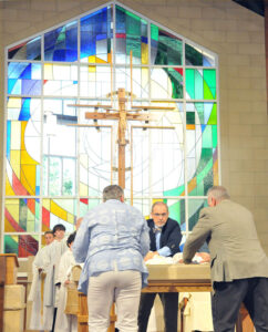 During the Rite of Dedication, a first for the bishop, parishioners placed authentic relics into the altar. Bishop Walsh poured chrism oil on the center and four corners of the stone altar to represent the five wounds of Christ and spread the oil across the table. Afterwards four parishioners wiped the oil with white towels and dressed the altar. Four priests anointed the four dedication crosses spaced around the church. Parishioners later lit candles at those four locations.