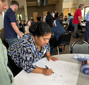 Anna Maria Billy, director of Evangelization for St. Joseph Parish in Ottumwa, participates in a visual brainstorming activity during the Catechetical Leader Summit Aug. 13 at Holy Family Parish Hall in Riverside.