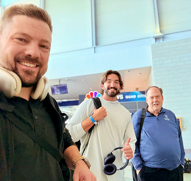 From left, Trevor Pullinger, Zac Robinson and Bishop Dennis Walsh prepare to leave for a Life Teen Summer Camp in Georgia earlier this summer.
