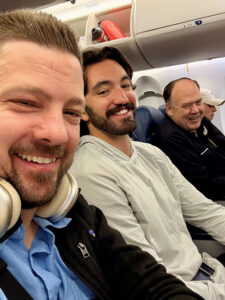From left, Trevor Pullinger, Zac Robinson and Bishop Dennis Walsh smile aboard an airplane on the way to Georgia for a Life Teen Summer Camp earlier this summer.