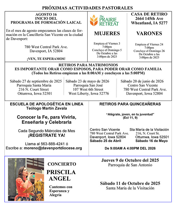 PRÓXIMAS ACTIVIDADES PASTORALES 2025-2026 Support The Catholic Messenger’s mission to inform, educate and inspire the faithful of the Diocese of Davenport – and beyond! Subscribe to the print and/or e-edition which has more content, or make a one-time donation, today! Related posts: Don’t walk the pilgrim path of faith alone / No camines solo por el sendero de la fe Celebrando 50 años de la Reunificación Familiar Caja de preguntas: Rezar el Rosario antes de misa Programa de Formación “San Francisco de Asís” Posted on Oct 30, 2025Oct 28, 2025