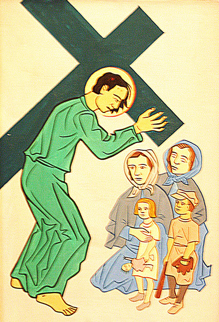 As I walked out of the chapel, I noticed unusual images on the wall. Instead of a typical Stations of the Cross display depicting Roman soldiers and civilians dressed like they would have been over 2,000 years ago, there were people in 20th century style clothes crowding around Jesus. In one painting, a little girl holding a doll and a boy with an American baseball glove and bat are watching as Jesus goes by with the cross. I later learned that Father Edward Catich had created the art. I had never heard of this internationally famous priest-artist who founded the St. Ambrose University art department. He is known for calligraphy and did the main lettering on The Messenger front page that is still used today. His work caused controversy in its time for depicting sacred themes in unconventional ways. I wondered why he would show modern children as witnesses of the crucifixion.
