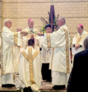Colleen Goebel of the cathedral had mixed emotions watching the ordination. “To see him process to the altar as God’s humble servant presenting himself to take the next step was the time to realize he was now theirs and no longer ours. Then seeing the gold miter placed upon his head, it sunk in that he was now truly a successor to Peter in the apostolic line of succession from the beginning of the Church.”