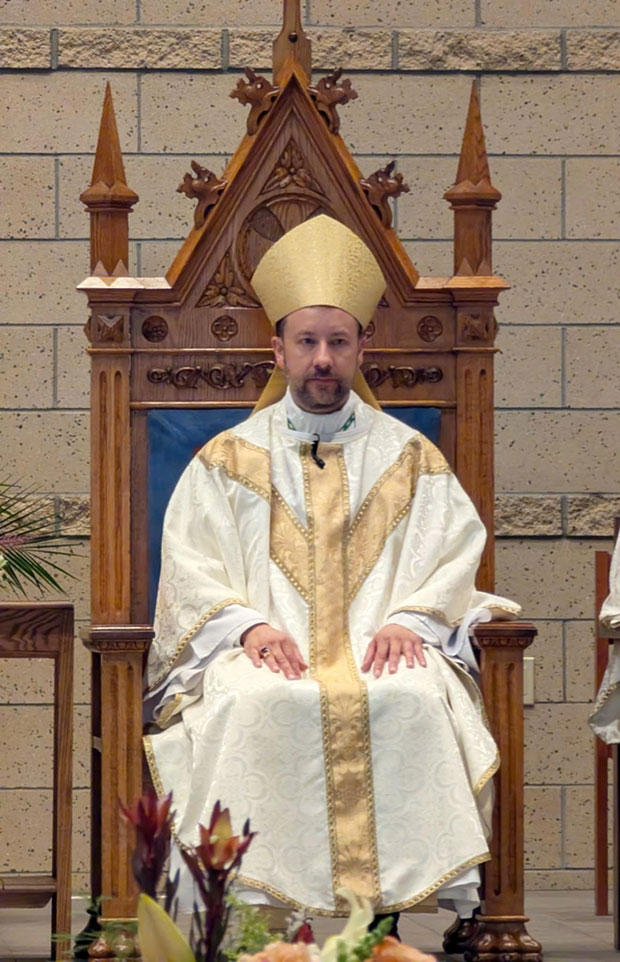 Bishop Thom Hennen sits in the cathedra (bishop’s cathedral chair) during his ordination and installation Mass Sept. 29 at St. Francis of Assisi Church in Bend, Oregon.