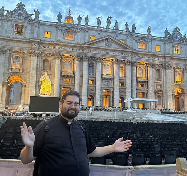 Father Guilllermo Treviño stands outside the Vatican during a recent visit and talk.