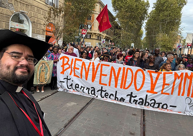 Father Guillermo Treviño poses in front of a group walking for the World Meeting for Popular Movements at the Vatican. Father Treviño was a speaker at the event.