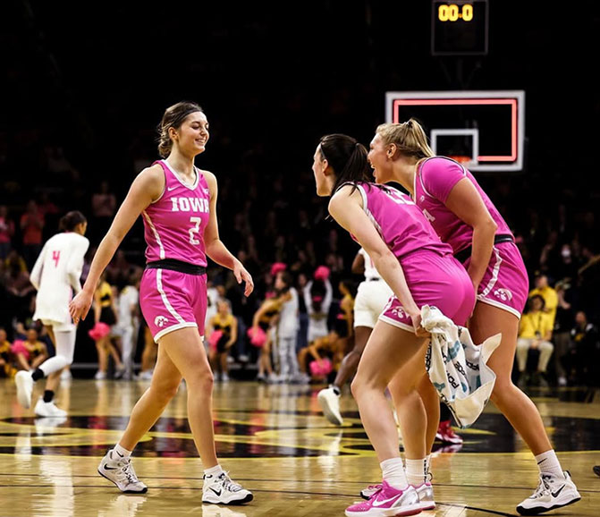Iowa guard Taylor McCabe, left, celebrates with teammates Caitlin Clark and Sydney Affolter during a basketball game at Carver-Hawkeye Arena in Iowa City on Feb. 12, 2023.