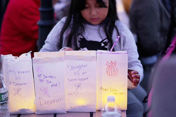 Eight-year-old Zuanny arranges luminaries with messages about her mother, a DACA “Dreamer,” herself and her sisters during a vigil at La Colaborativa in Chelsea, Mass., Oct. 10 for the community affected by raids and detentions by Immigration and Customs Enforcement.