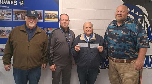 St. Mary Parish-Centerville’s Knights of Columbus council presented $687.50 checks to the community school districts in Moravia and Centerville to benefit special education programs. The donations were funded by the annual Campaign for Persons with Intellectual Disabilities (Tootsie Roll Drive). Additionally, the Knights presented $500 donations from their annual golf tournament to the Moravia, Centerville, Moulton-Udell and Seymour school districts to be used at each district’s discretion. Pictured are Knights of Columbus, from left, Bill Milani, Kevin Cochran and Ed Pancrazio, with Moravia Community School District Superintendent Sam Swensen.