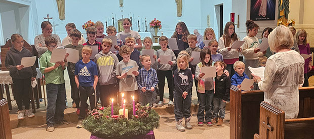Religious education students sing The Advent Song during an Advent retreat last month at St. Patrick Catholic Church in Delmar. Catholics from Our Lady of the Holy Rosary Parish-Lost Nation, Assumption & St. Patrick Parish-Charlotte, St. Patrick Parish-Delmar, Immaculate Conception Parish-Petersville and Ss. Mary & Joseph Parish-Sugar Creek participated in the annual event.