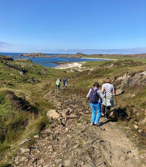 Hikers enjoy natural beauty on the Island of Iona off the west coast of Scotland.