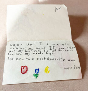 Beneath the artwork, printed in pencil, I wrote: To Dad with Love. The text inside the card, with one misspelling, read: “Dear dad, I Love you with all my heart. If you ever die my heart wold be lost forever. You are my only hope. You are the best dad in the world. Love, Barb