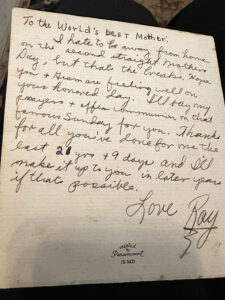 I hate to be away from home on the second straight Mother’s Day, but that’s the breaks. Hope you and Gram are feeling well on your honored day. I’ll say many prayers and offer Communion on that famous Sunday for you. Thanks for all you’ve done for me the last 21 years and 9 days and I’ll make it up to you in later years if that’s possible. Love, Ray
