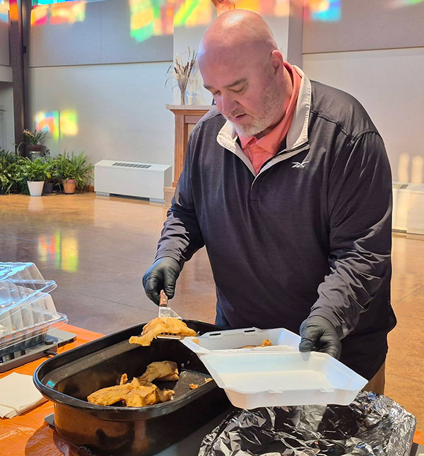 Jeff Maki scoops up a serving of fish during Sacred Heart Parish-Newton’s fish fry dinner on Feb. 20.