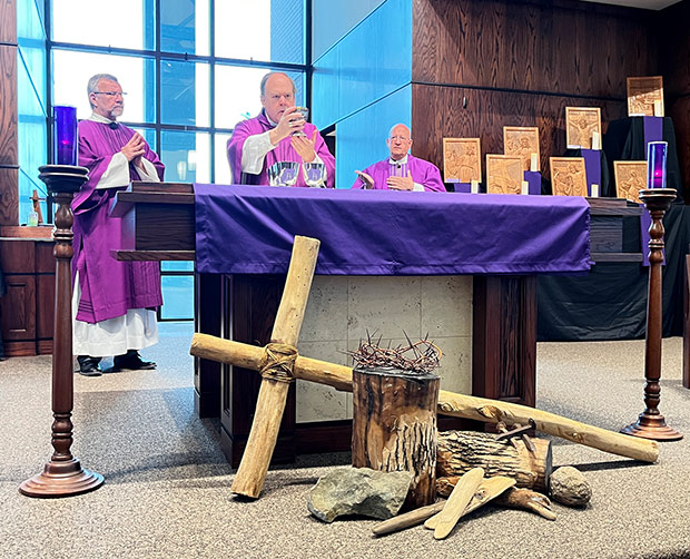 Symbols of Holy Week are seen in front of the altar at St. Ludmila Parish in Cedar Rapids, Iowa, during the Iowa Catholic Youth Conference March 22. Pictured, from left, are Deacon Mike Linnenbrink and Bishop Dennis Walsh of the Diocese of Davenport, and Father Ken Glaser of the Archdiocese of Dubuque.