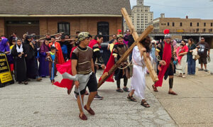 Members of St. Anthony Parish in Davenport reenact the Stations of the Cross in downtown Davenport on Good Friday 2025.