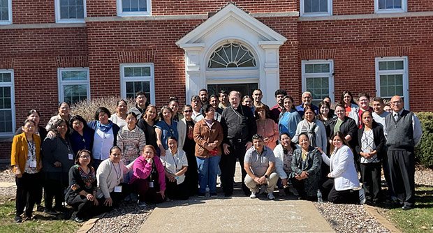 Participantes del programa de Formación Laical posan para una foto con Mons. Dennis Walsh afuera del Centro San Vicente en Davenport sábado 21 de marzo.