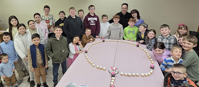 Father Joseph Phung and religious education students from St. Mary Parish in Oskaloosa pose for a photo with a cupcake rosary at the parish’s Hail Mary Challenge kick-off party in February.